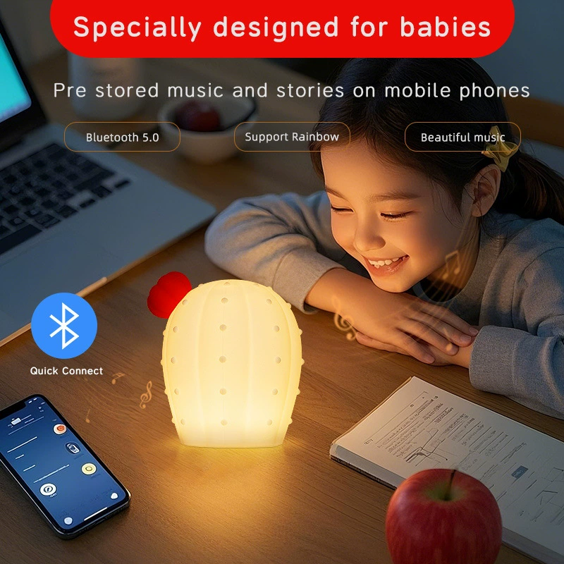 Das farbenfrohe Cartoon Pat Night Light verfügt über ein integriertes Bluetooth 5.0-Modul, sodass Mobiltelefone drahtlos vorgeführte Schlaflieder und Märchen spielen können. Halten Sie den Kaktus und hören Sie Geschichten vor dem Schlafengehen. Die warme leichte und sanfte Musik erzeugen eine multisensorische, beruhigende Kombination, sodass die Eltern freihändig bleiben und den Prozess des Beruhigten ihres Babys zum Schlafen lindern können.